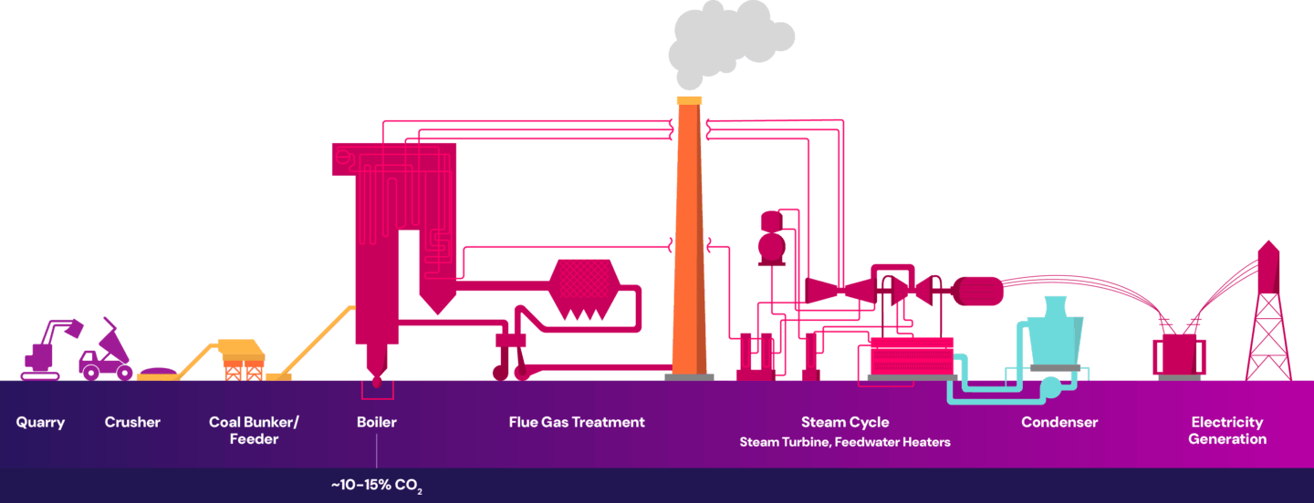 In coal-fired power plants, coal is burned in a boiler to generate heat. This heat produces steam which is used to spin a turbine and generate electricity. The combustion of coal in the boiler is a key component in generating electricity and is the primary source of CO2 emissions in the process. The single point source emissions are then released out of the flue gas stack, as shown below.