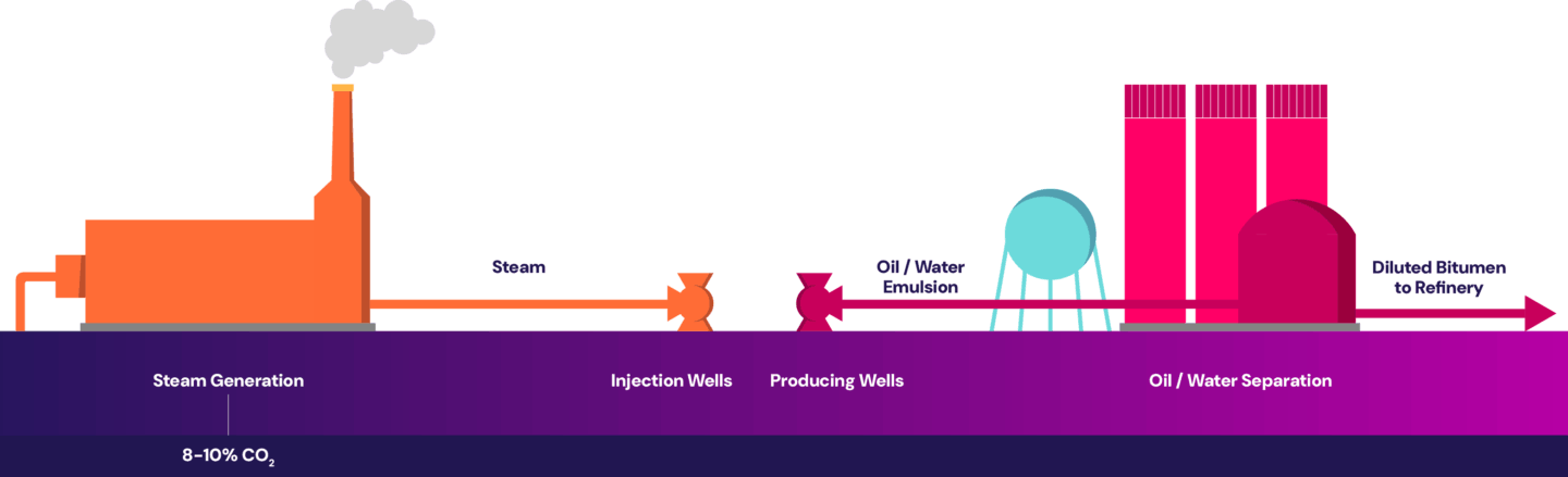 The SAGD process requires high-pressure, high-temperature steam to be injected several hundreds of meters underground to heat the heavy bitumen, allowing it to flow to surface through a production well. The primary source of CO2 emissions comes from burning natural gas in the steam generators to produce steam. The point source emissions are then released out of the steam generator’s flue gas stack, as shown below.