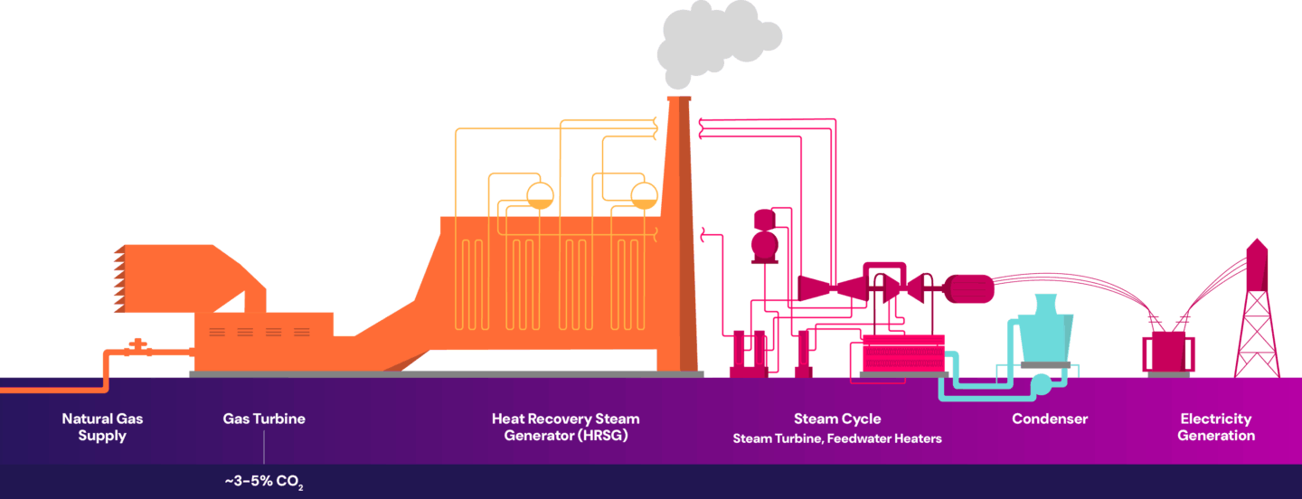 In natural gas-fired combined cycle power plants, natural gas is burned in a gas turbine to generate electricity. The hot exhaust gases from this process are then used to produce steam, which drives a steam turbine to generate additional electricity. The combustion of natural gas is a key component in generating electricity and is the primary source of CO2 emissions in the process. The single point source emissions are then released out of the flue gas stack, as shown below.
