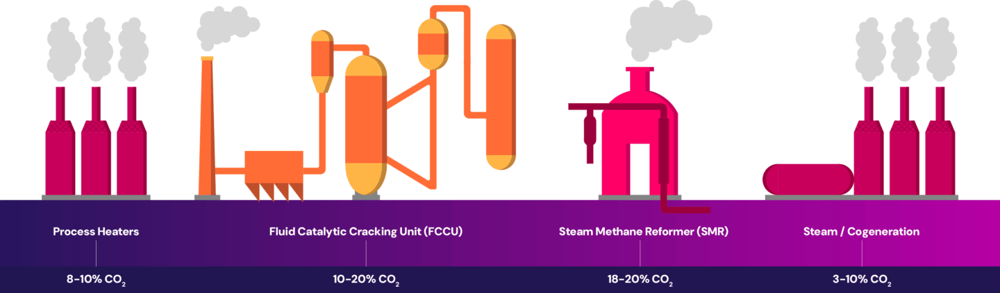 Oil refineries have multiple emission sources throughout the operations. At a refinery, emissions are generated from the combustion of fuel in process heaters which heat the crude oil for processing. The fluid catalytic cracking unit (FCCU) converts heavy hydrocarbons into lighter hydrocarbons, generating emissions from the chemical reactions. The production of hydrogen from the steam methane reformers (SMR) produces emissions through the combustion of fuel to supply heat and from the chemical reaction that takes place in the reforming process itself. The refinery also creates emissions from power and steam generation. The emissions are released at each source throughout the process, as shown below.