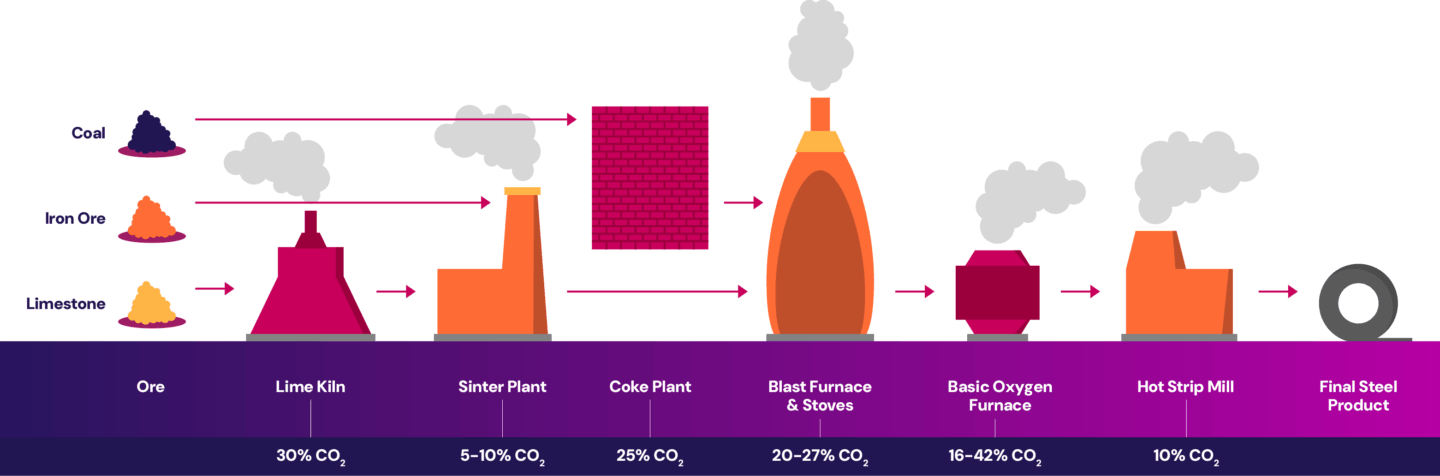 The steelmaking process generates emissions from the refining of crude iron in the basic oxygen furnace to produce molten steel and eventually slabs. Emissions are also created from combusting fuel for the reheat furnace in the hot strip mill to reheat the slab before it’s rolled into a final product. Emissions are released at each point in the process, as shown below.