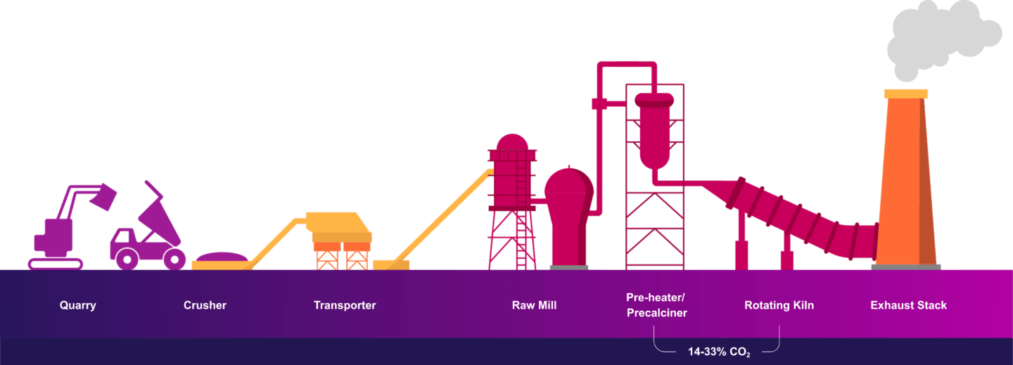 Cement production involves crushing and blending raw materials (e.g. limestone, clay, etc.) and subjecting them to high temperatures in the kiln to form clinker. The calcination of limestone is essential for creating clinker. The transformation happens at temperatures above 1,400 degrees Celsius and creates most of the CO2 emissions, with the remainder of emissions coming from the combustion of fuel to heat the kiln. Single point source emissions come from the exhaust stack of the cement kiln, as shown below.