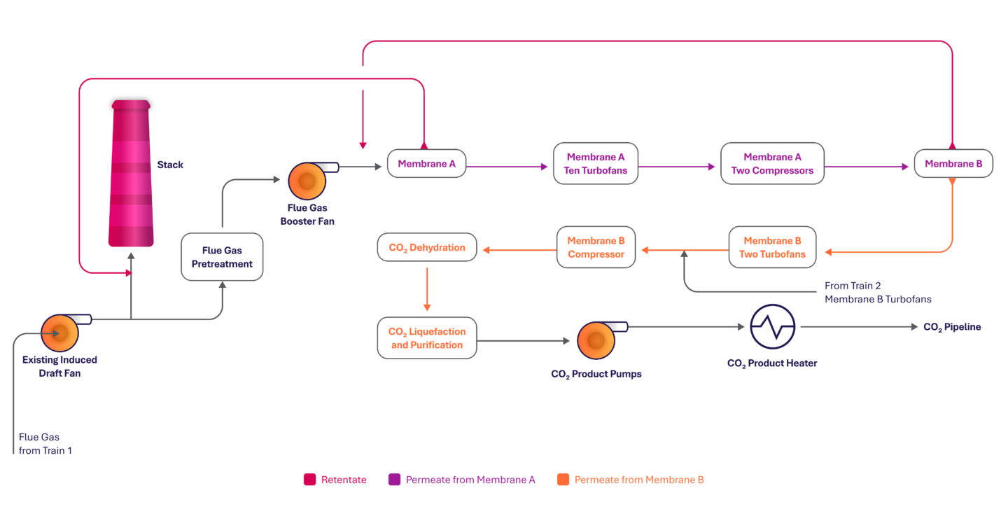 Each flue gas train is first pre-treated by the sulphur dioxide (SO2) polisher and the direct contact cooler (DCC). The trains are then pressurized by a booster fan before entering the first stage membrane (Membrane A). Membrane A is designed to allow a CO2-rich gas stream (permeate) to pass through the membrane, increasing the CO2 concentration within the stream. The remaining CO2-depleted flue gas stream (retentate) returns to the existing power plant stack and is released to the atmosphere.