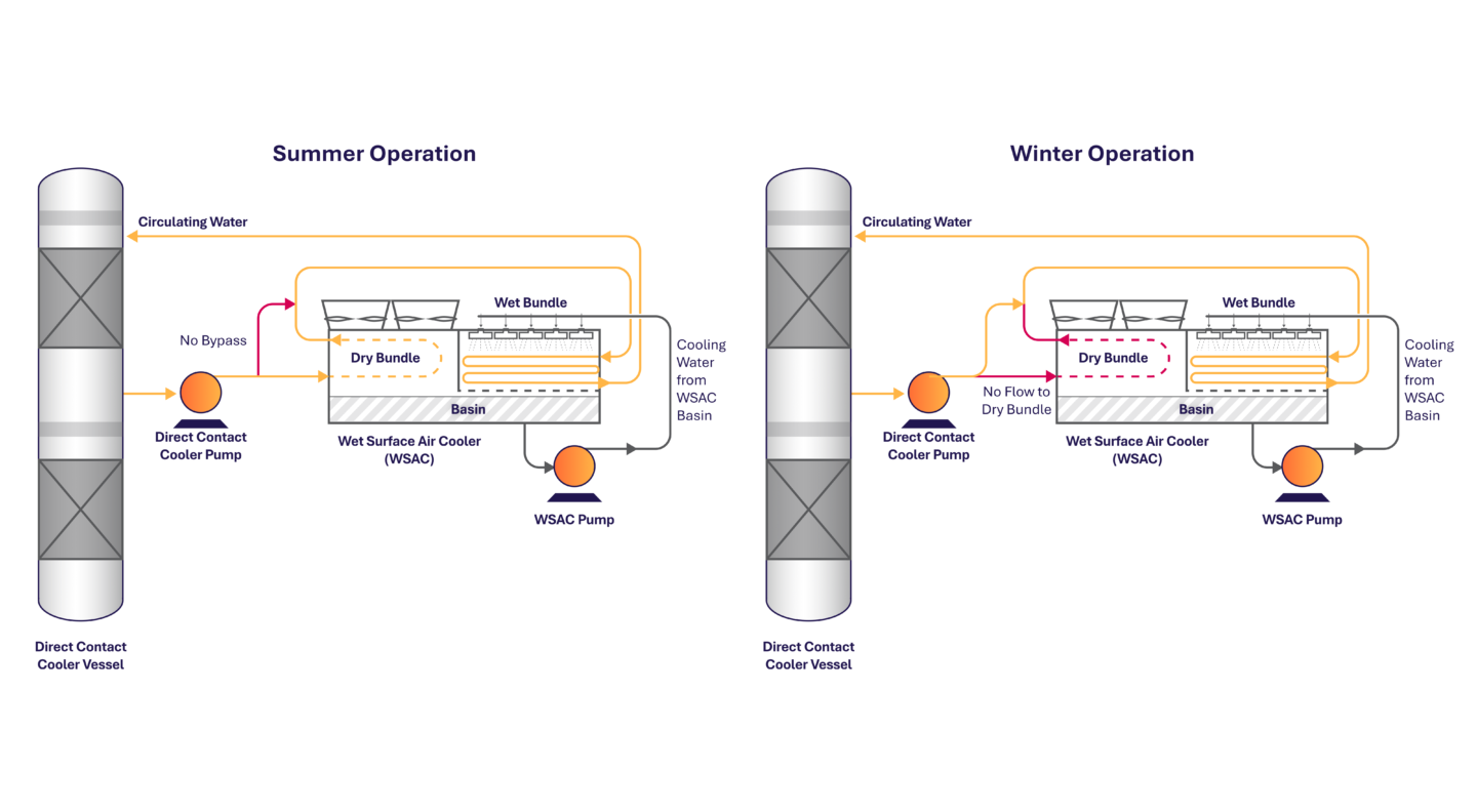 Compared to fully air-cooled systems, the advantage of WSAC coolers is that they can achieve a final cooling temperature that is closer to the lowest possible temperature set by the ambient humidity. By integrating the strengths of both cooling systems, hybrid WSACs ensure the cooling demands of the capture plant are met.